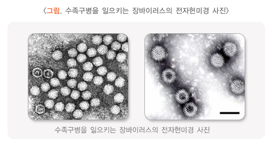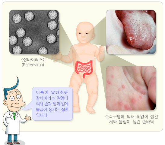 수족구병은 주로 엔테로바이러스에 의해 발생하는 질병으로, 손, 발, 입에 물집이 생기는 것이 특징입니다.