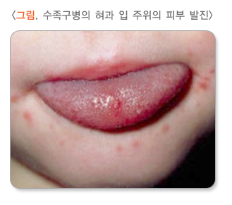 입천장, 혀, 뺨 안쪽에 작고 붉은 물집이나 궤양이 생기며, 너무 아파서 음식을 잘 먹지 못하는 경우가 많습니다. - 손과 발의 수포성 발진