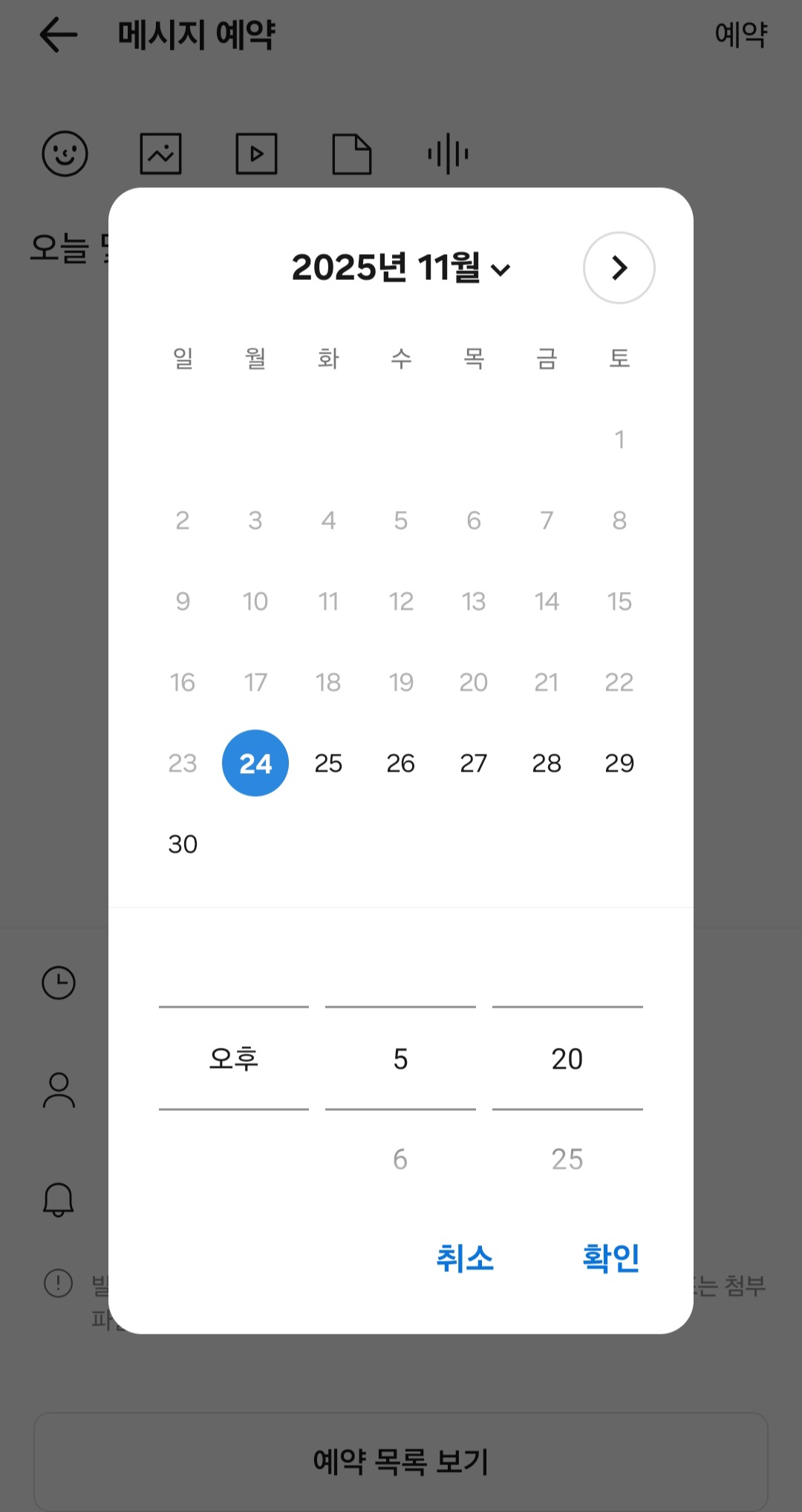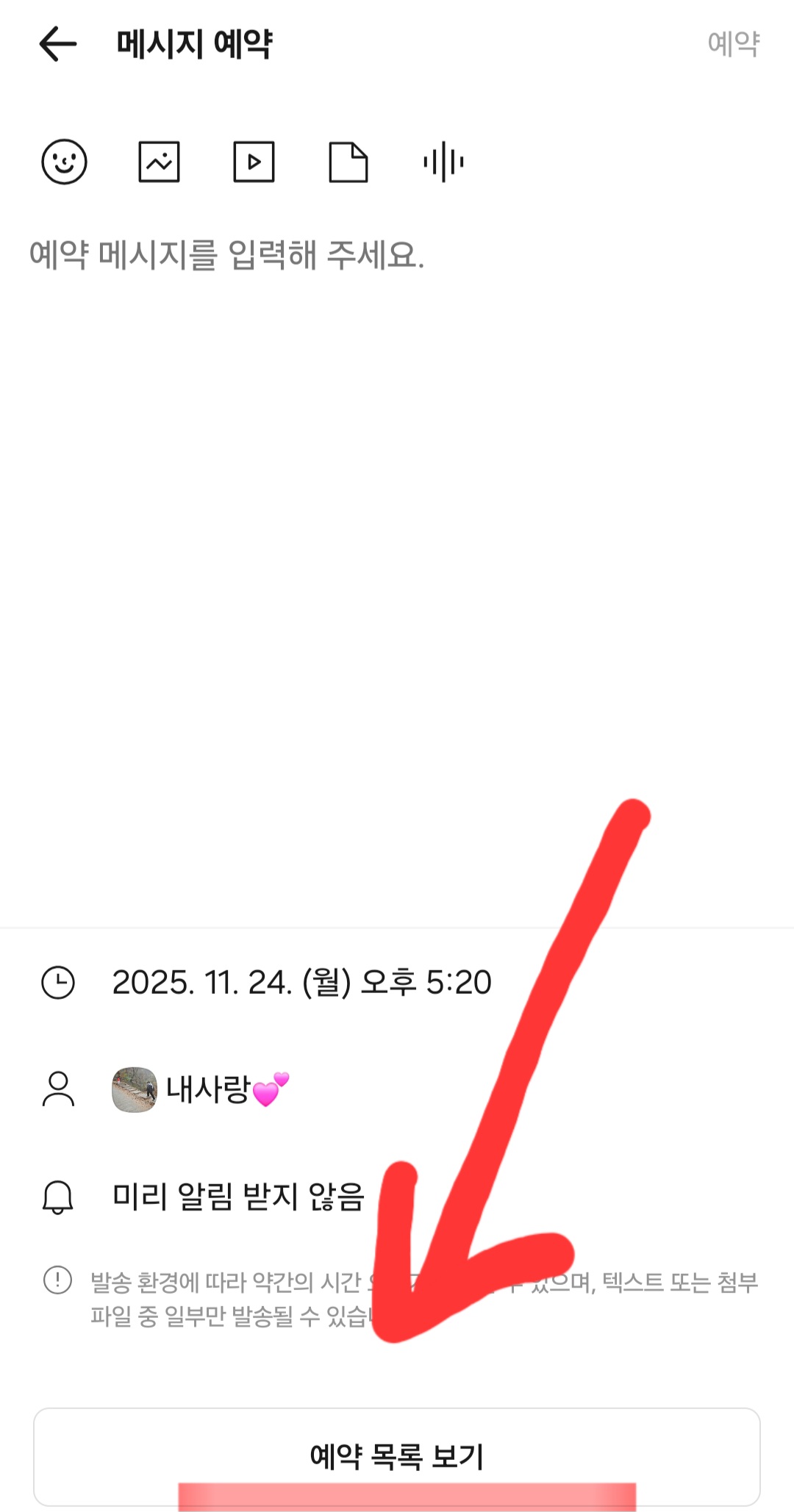 메시지를 미리 입력 → 더보기 메뉴 → 예약 시간 설정